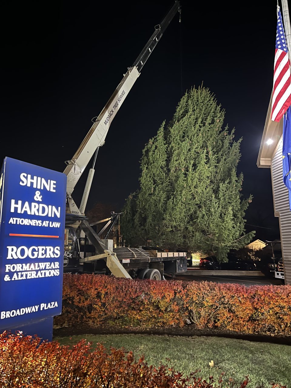 The tree lighting ceremony will take place at 6:00 p.m. A towering 40-foot Colorado Blue Spruce weighing in at 6,000 pounds, adorned with over 40,000 lights, will be lit to music and a synchronized fireworks display. Children will receive Santa hats, candy canes, and gifts from Deister Machine Company.